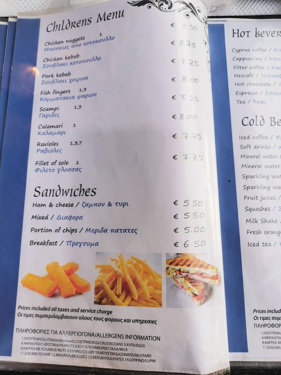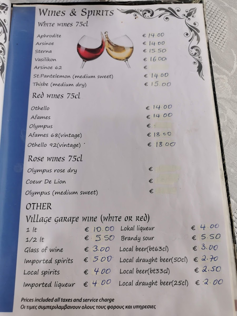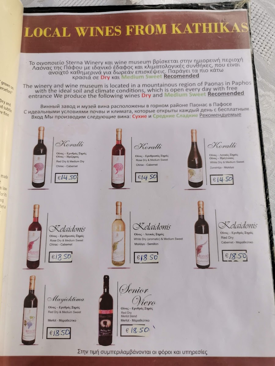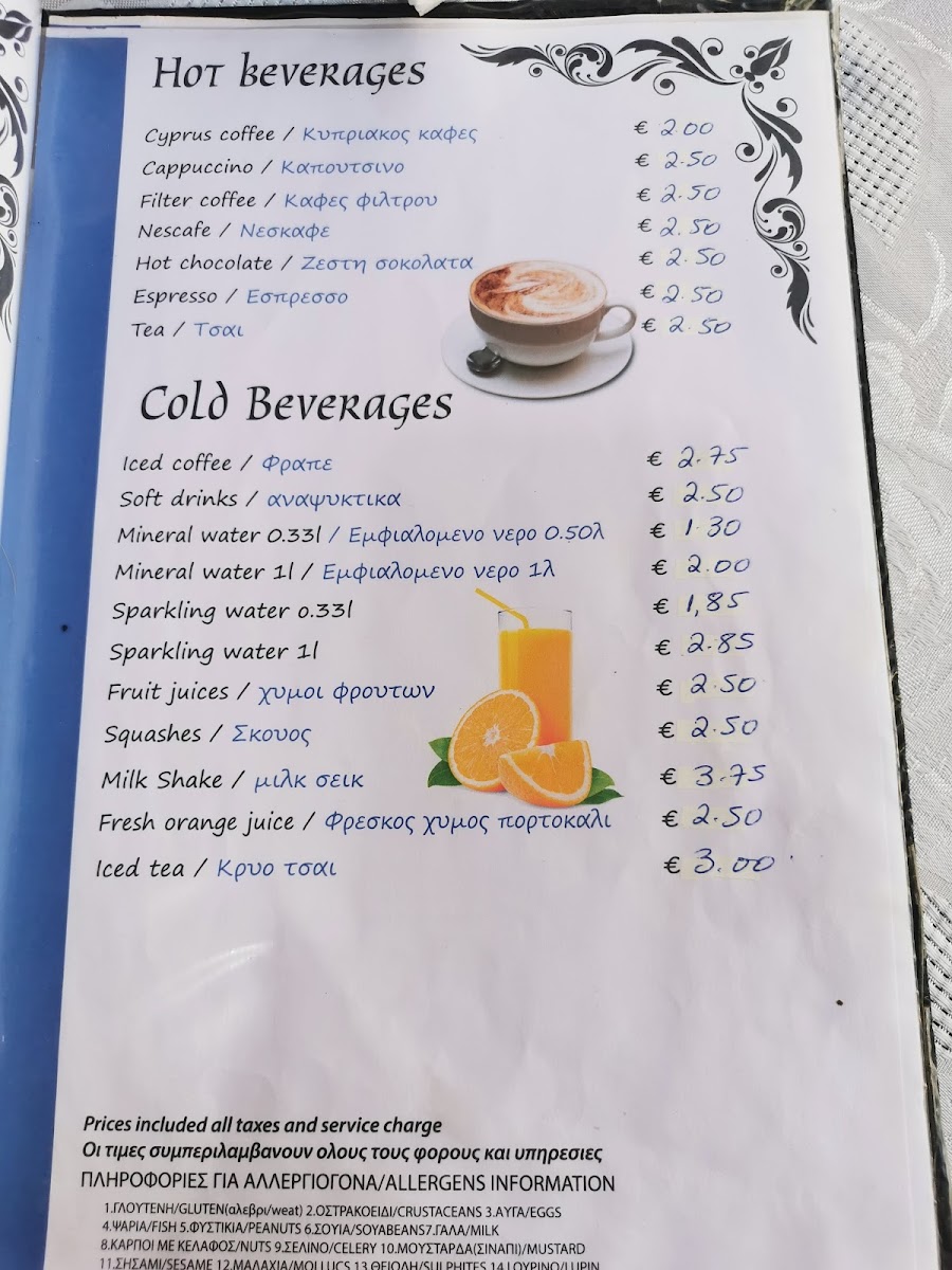 The main courses are equally impressive, with the Sea Bass standing out as a fresh and flavorful seafood option. For pasta lovers, there are Various Pasta Dishes available, each prepared with a Mediterranean twist, providing a rich and satisfying meal. To pair with the meals, the restaurant offers a selection of drinks including Cypriot White Wine and Cypriot Red Wine, allowing diners to enjoy a true taste of Cyprus. For beer enthusiasts, Keo Beer and Kaltes Bier are great choices to complement any dish.